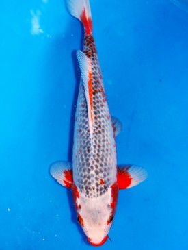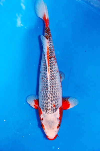 Kräftiger Asagi mit reichlich Zukunftspotential. Kräftiges, sehr symetrisch verteiltes rot und eine leichte Konoko Beschuppung verleihen diesem Koi ein interessantes Erscheinungsbild. Foto von 03.2025
