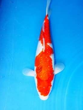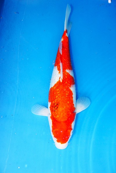 Kräftiges Rot gepaart mit reinem Weiß. Die funkelnde Ginrin Beschuppung verleiht diesem Koi einen tollen Glanz.