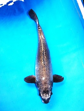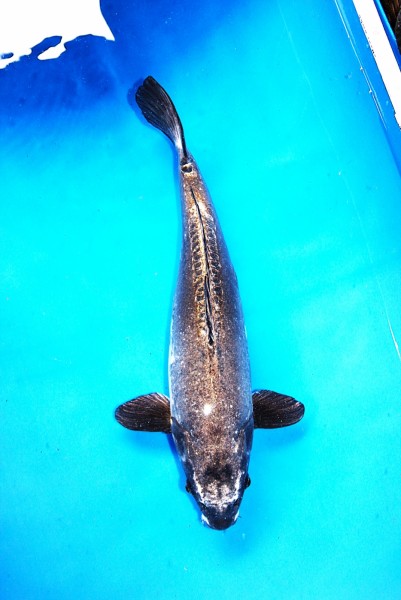 Bild aus 7.2025 Nahezu perfekter Koi. Gutes Größemwachstum welches bei Doitsu Variätäten recht selten gegeben ist. Symetrische Kopfzeichnung und tolle Farbgebung der Flossen.