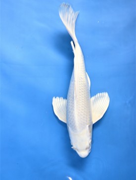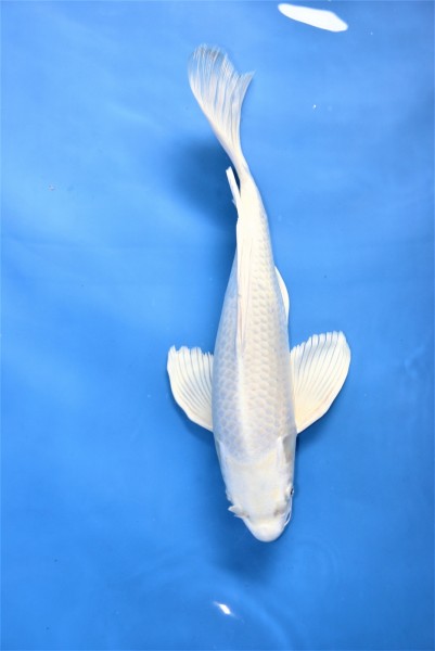 Sehr gut gewachsener, absolut rein weißer Butterfly. Der Eyecatcher für jeden Koiteich. Bild vom Juni 2023