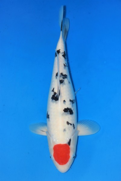 High Quality Koi - Absolut traumhafter Tancho Sanke. Schöne, gut verteilte Zeichnung mit reinem Weiß und sattem Schwarz. Ein Koi mit reichlich Potential der sich in den kommenden Jahren zur absoluten Schönheit entwickeln wird. Jumboblutlinie! Bild vom Juli 2023