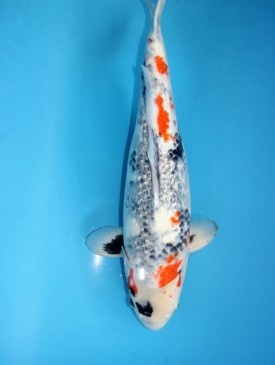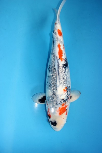 Dieser Showa gleicht einem funkelnden Edelstein. Kräftiger Body und eine absolut kräftige, helle Ginrinbeschuppung zeichnen diesen Spitzenkoi aus. Bild vom Juni 2023