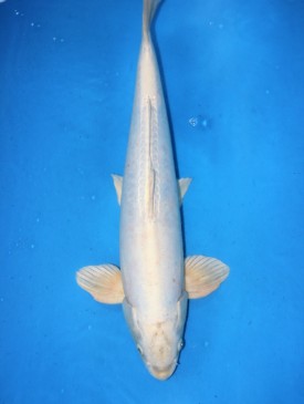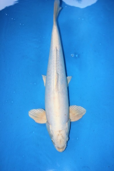 Großer männlicher Platin Ogon. Großer, günstiger Koi. Bild vom Juni 2023